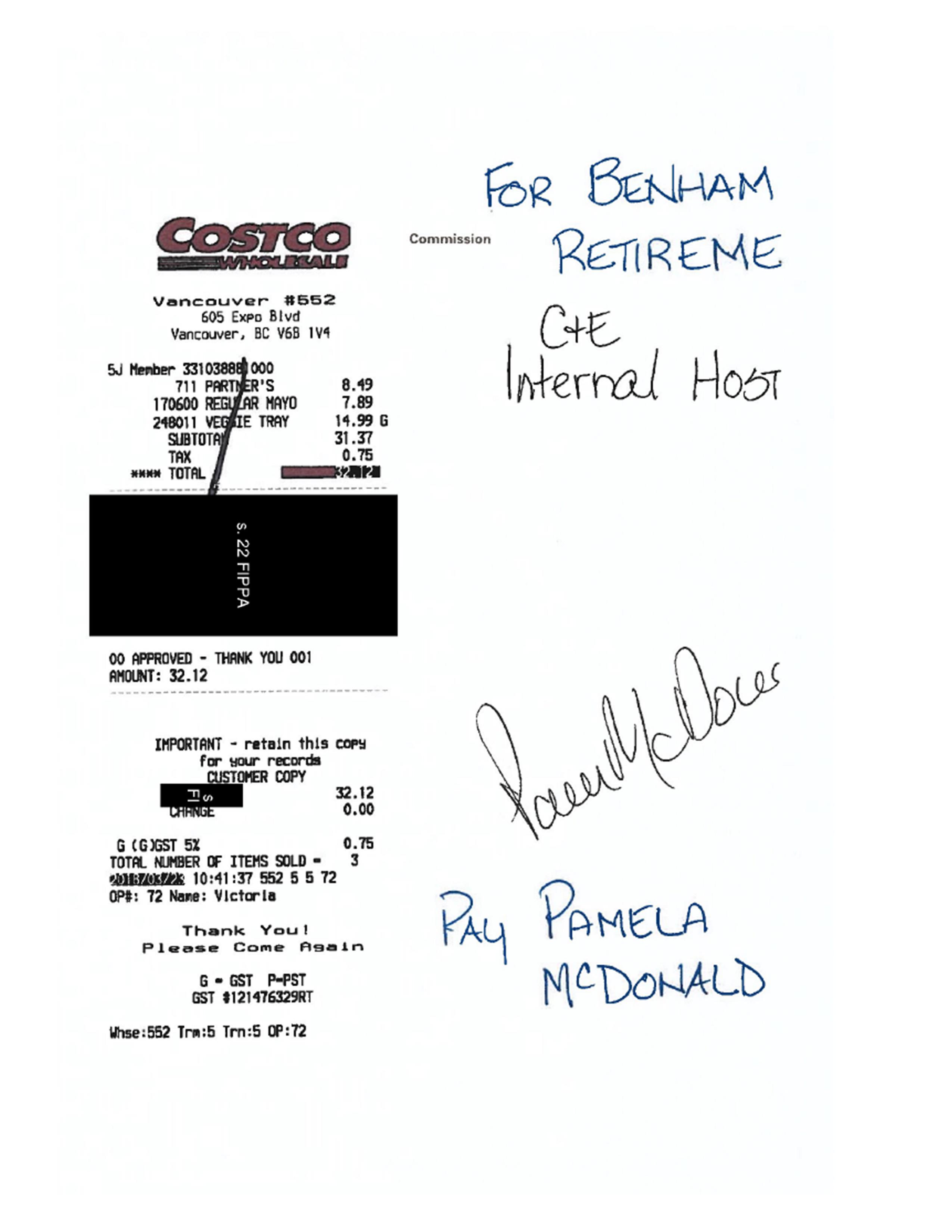 It appears that for whatever reason, McDonald was in charge of gathering supplies for a party for a fellow staff member’s (Brenda Benham) who was leaving the commission. As you will see below – she ventured out of her cozy little office and made stops at Safeway (Cheese and Fruit Platters), Costco (Veggie Tray), and the Party Bazaar (for Balloons) to gather supplies for the going-away party.
